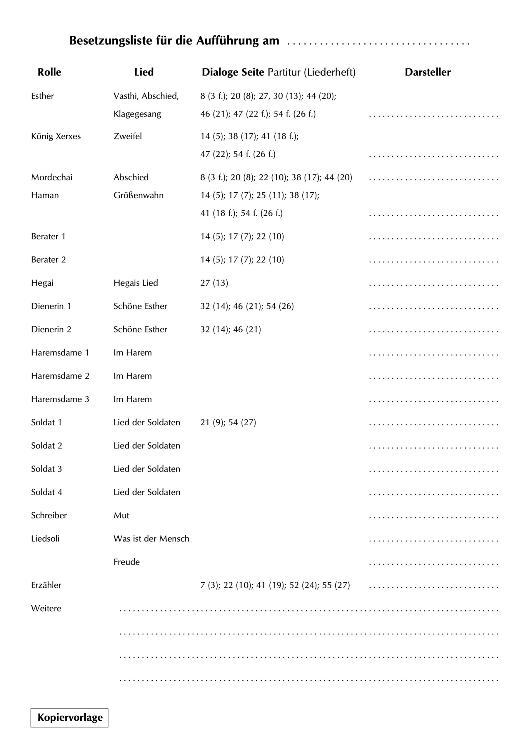 Dieses Musical des Autorenteams Andreas Mücksch und Barbara Schatz erzählt eine Geschichte des Alten Testaments, den Ursprung des jüdischen Purimfestes. Esther, die couragierte Heldin wird Frau des König Xerxes. Sie riskiert ihr eigenes Leben, um das Volk der Juden zu retten. Für die Freunde und Feinde der Königin, die Bürger von Susa und den Hofstaat sind im Stück viele Mitwirkende dabei.