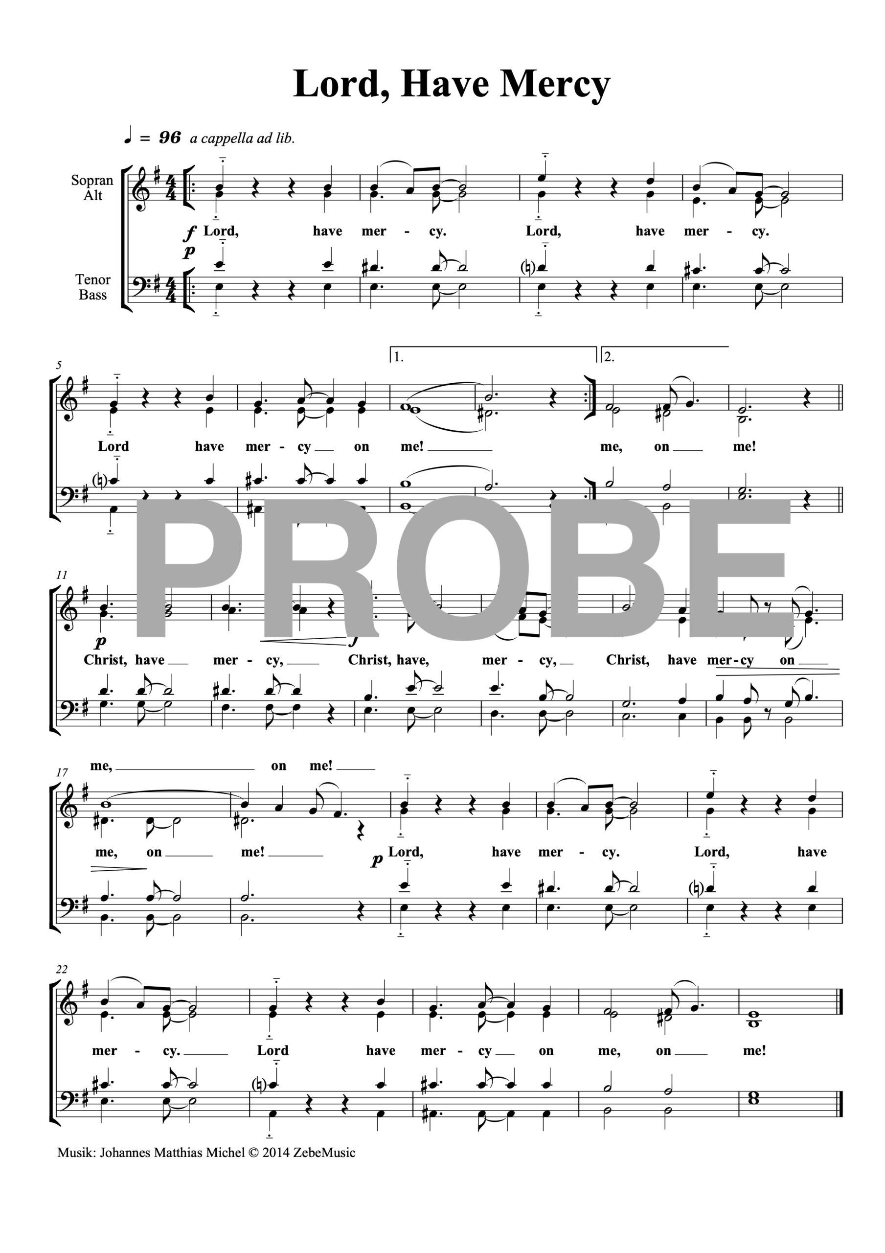 Englischsprachiges Kyrie für gemischten Chor (SATB) von Johannes Matthias Michel. Es ist liturgisch korrekt dreigegliedert; Lord have mercy – Christ have mercy – Lord have mercy. Die Gemeinde kann eingebunden werden.